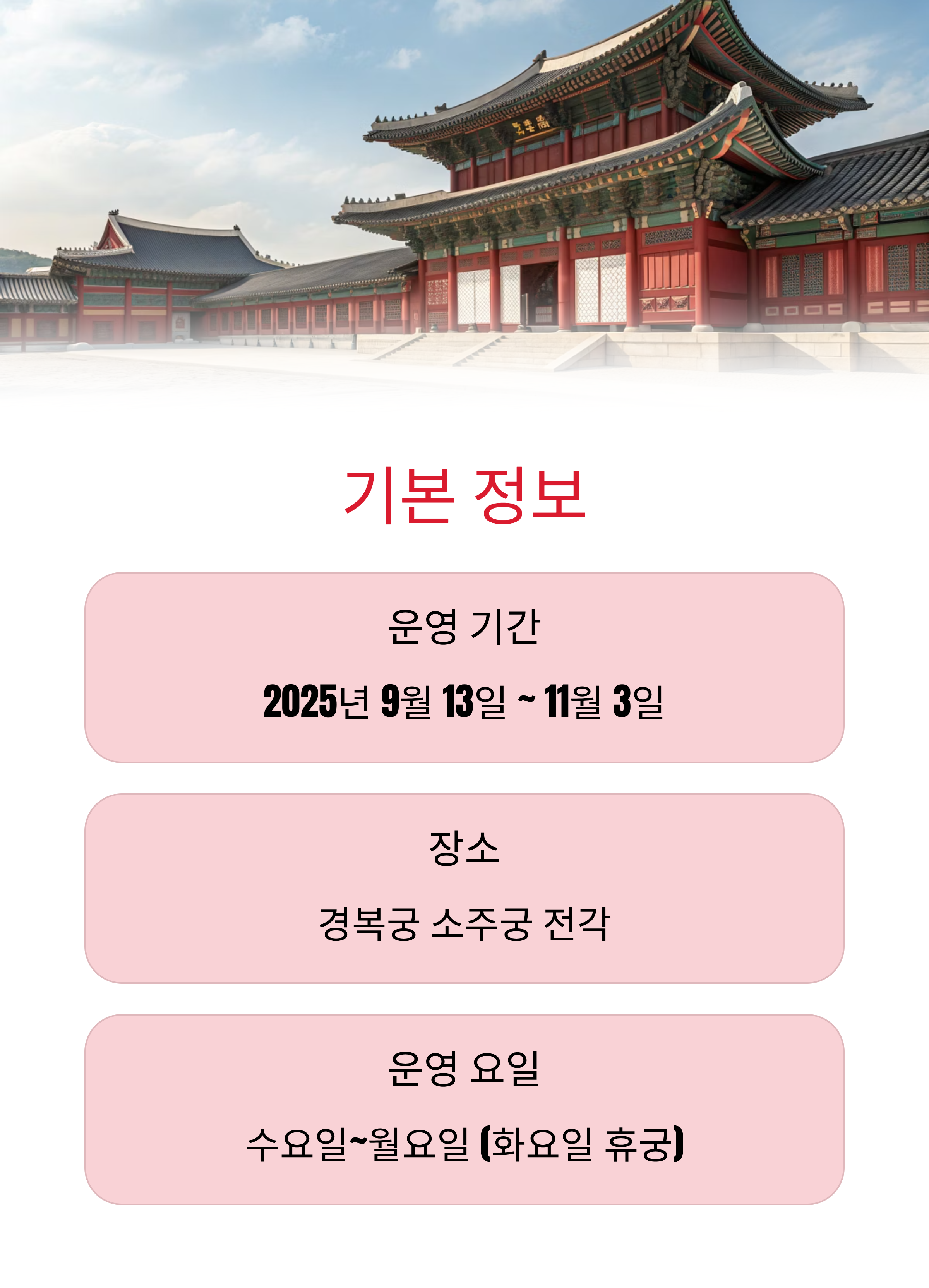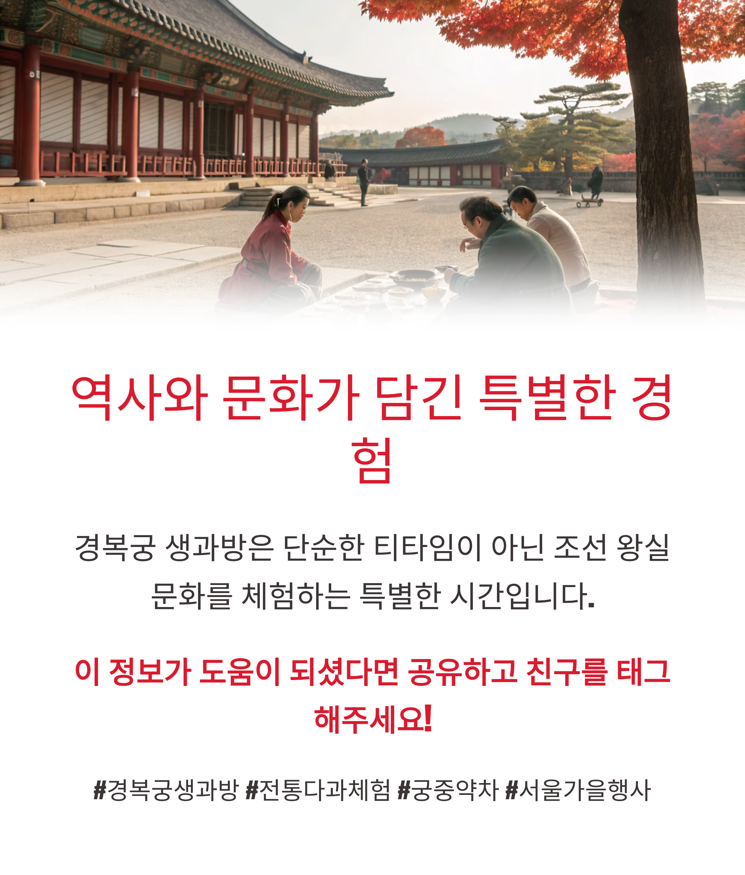 경복궁 생과방은 그저 맛있는 다과를 즐기는 자리가 아닙니다. 전통의 향기와 왕실 문화가 살아 있는 특별한 경험이 기다리고 있습니다. 예매권 추첨제로 진행되는 만큼 일정 확인과 빠른 신청이 핵심인데요, 올가을 고즈넉한 경복궁에서 시간을 보내고 싶다면 지금이 기회입니다.