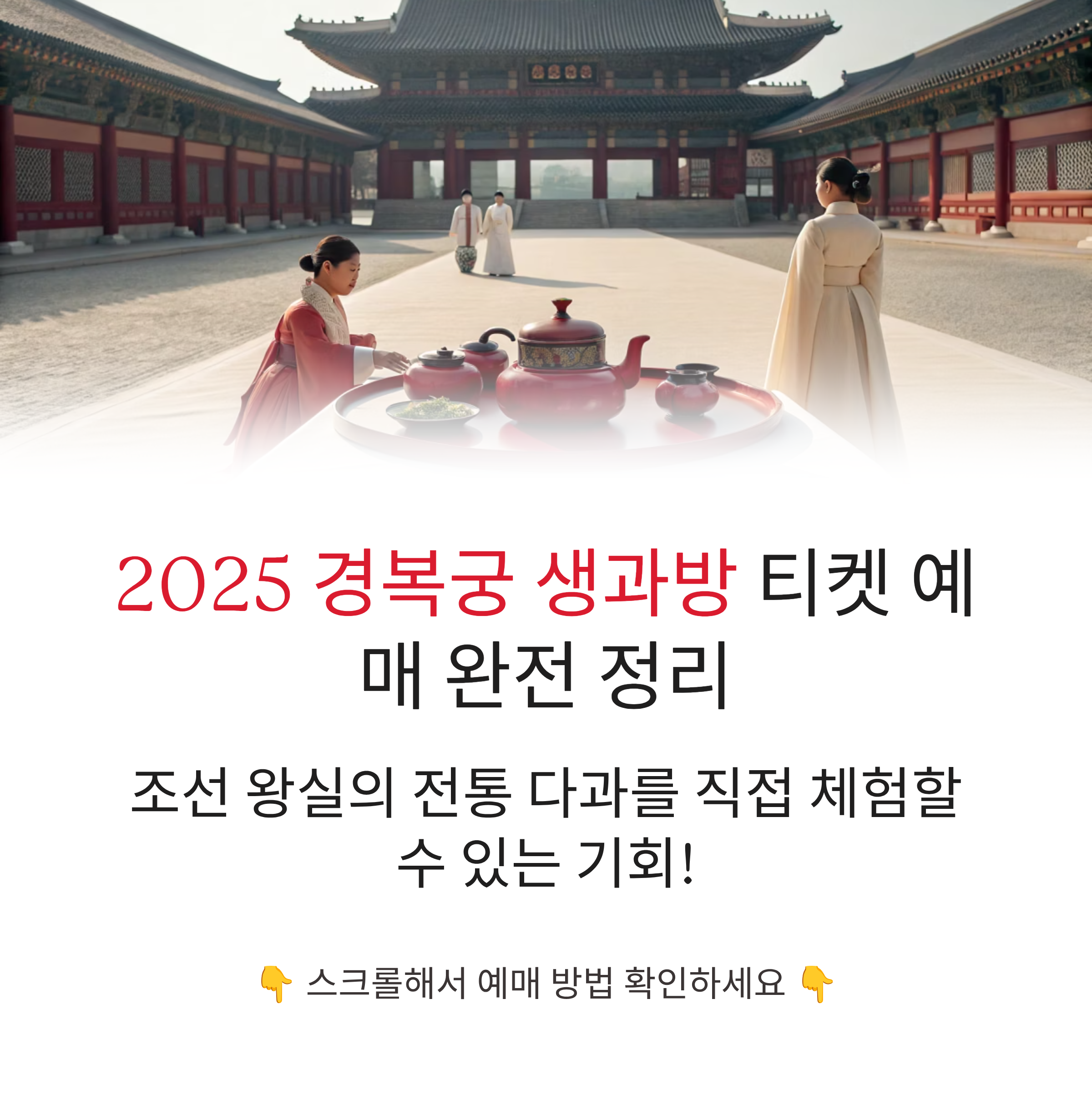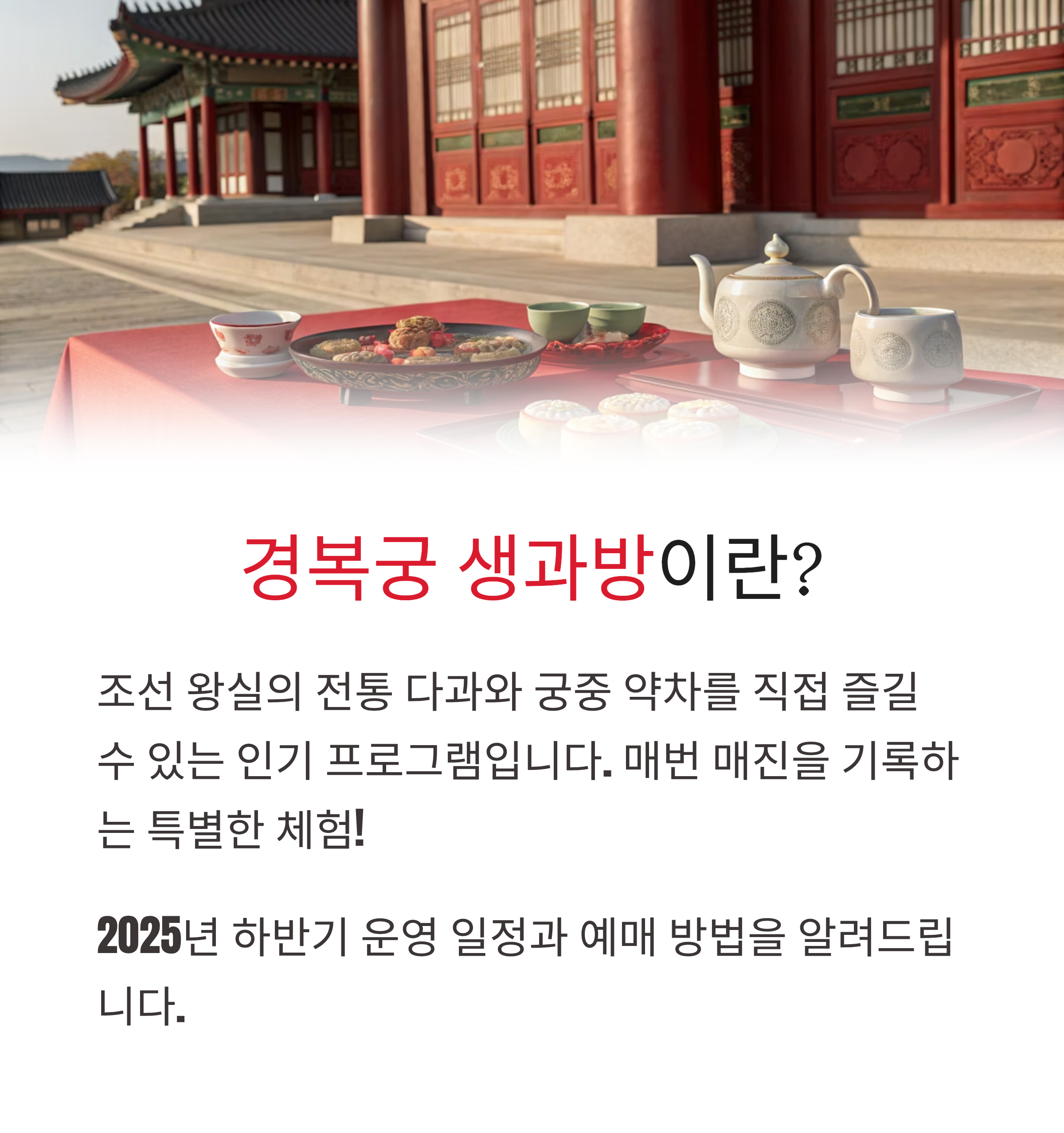 2025년 가을, 단순한 궁궐 나들이가 아닌 특별한 경험을 원하시나요? 경복궁 생과방은 조선 왕실의 다과와 궁중약차를 직접 맛보며 고궁의 정취를 느낄 수 있는 이색 프로그램입니다. 사전 추첨으로만 참여할 수 있어 매번 치열한 경쟁을 자랑하는데요, 이번 하반기 운영 일정과 예매 정보가 공개되면서 관심이 집중되고 있습니다.
